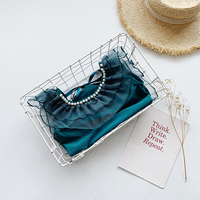 胸元の美しいレースフリルと背中の真珠風装飾が特徴的で、