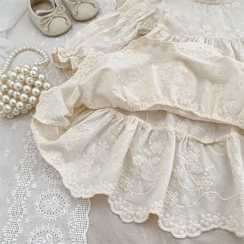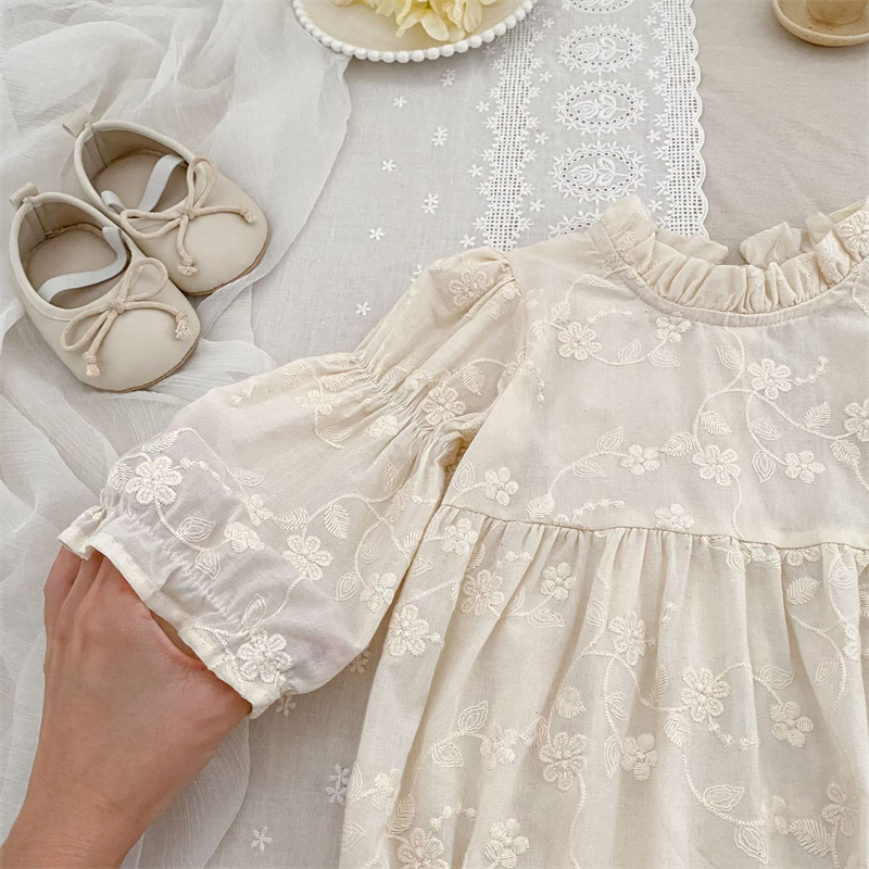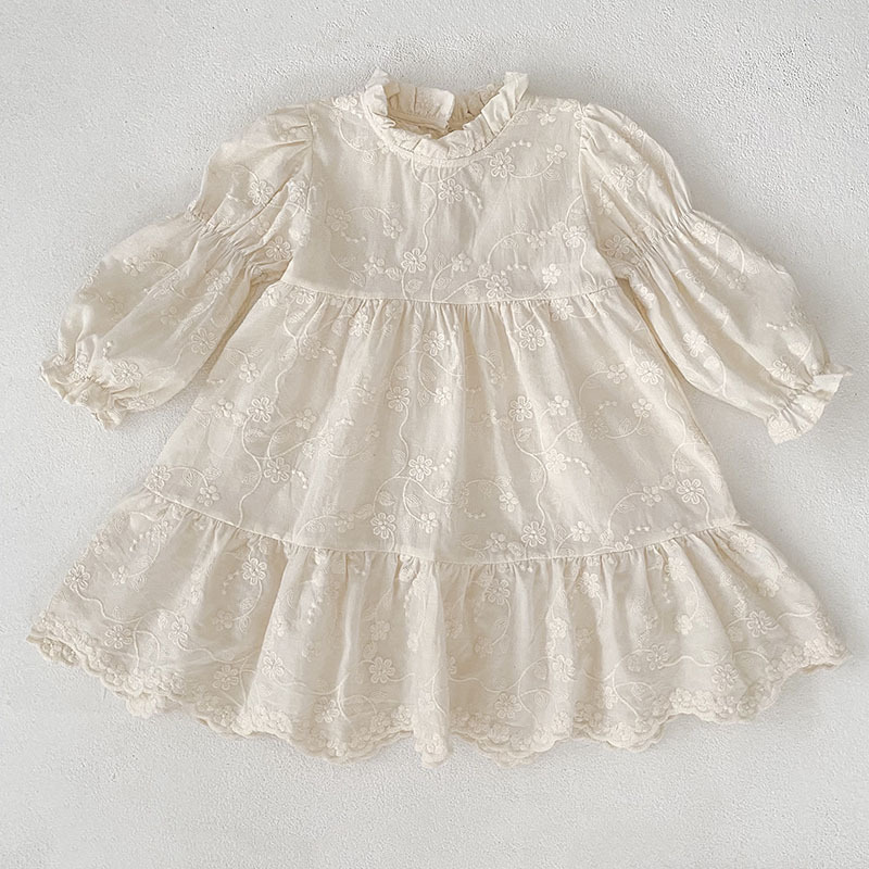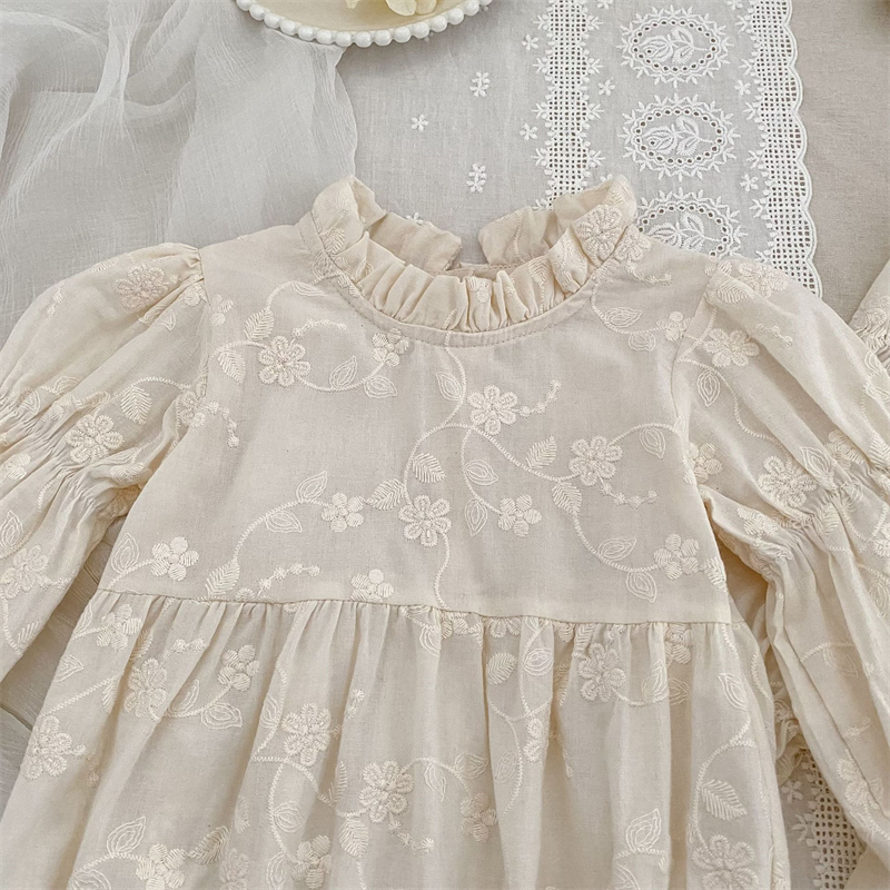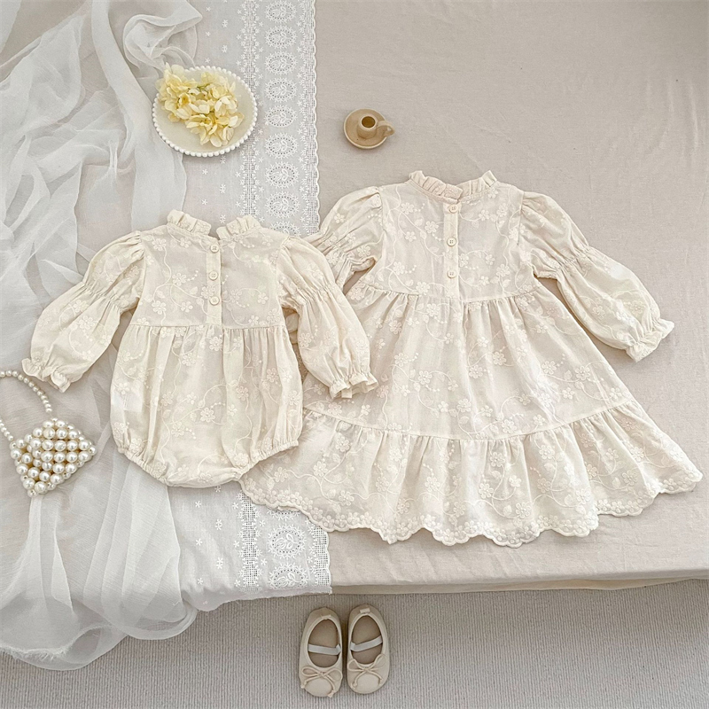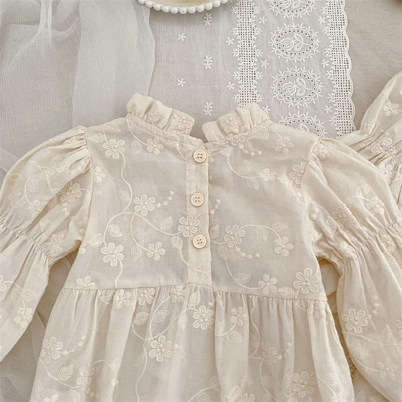 キッズ姉妹でお揃いコーデが楽しめる花柄刺繍の立ち襟デザイン。