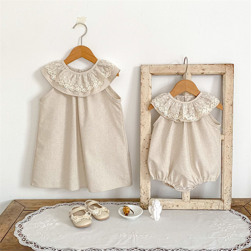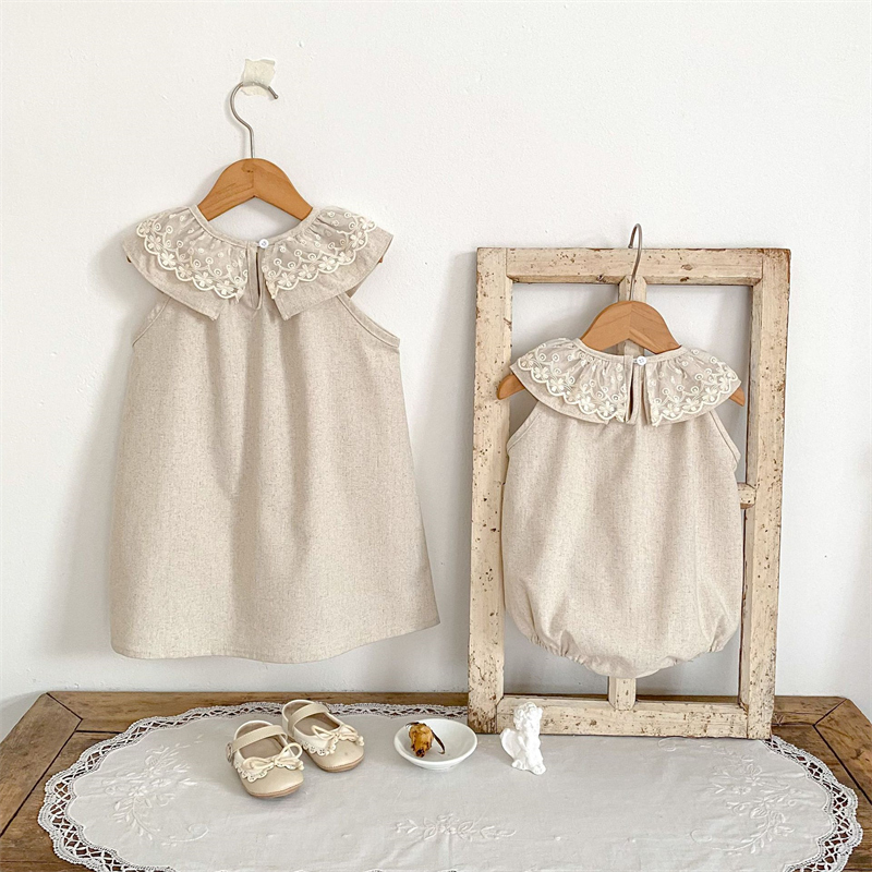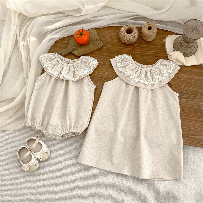 夏の新作キッズ姉妹服が登場!上品なレース襟が可愛らしいロンパースとロングワンピースのセットです。