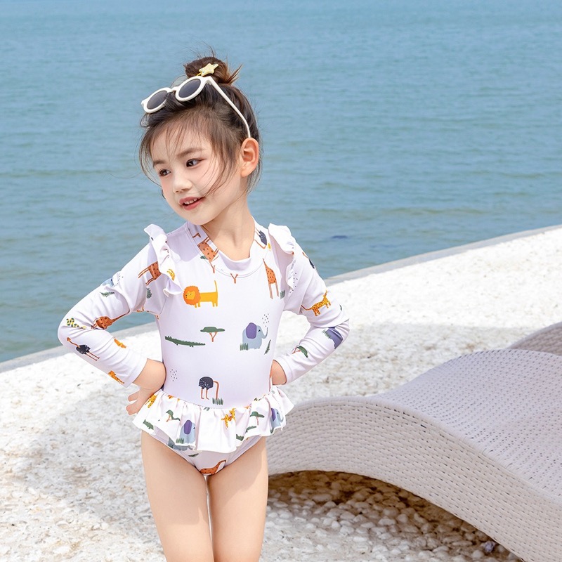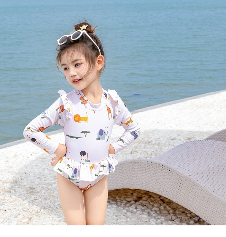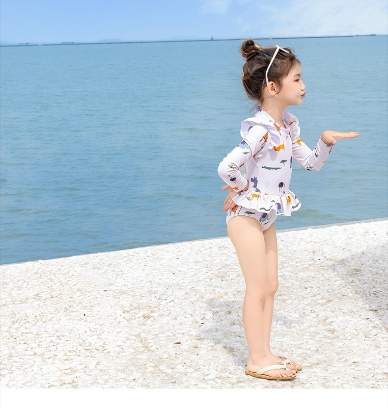 キッズ向けの可愛い動物柄が特徴的な長袖水着です。快適さと可愛らしさを兼ね備えたロングワンピース型で、
