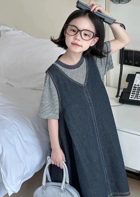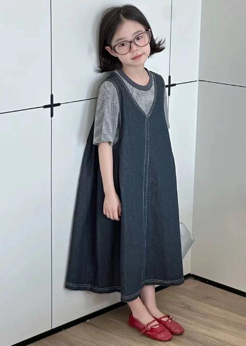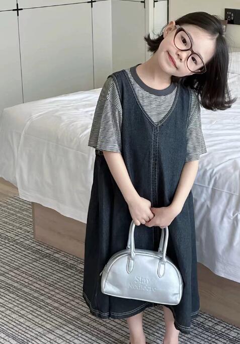柔らかなデニム素材のワンピースと縞模様のトップスがセットになっており、重ね着でかわいらしいスタイルが完成します。