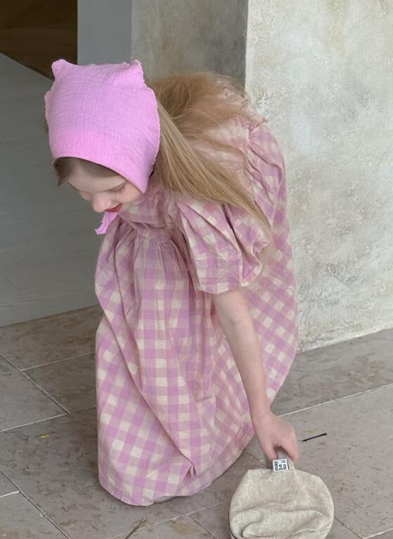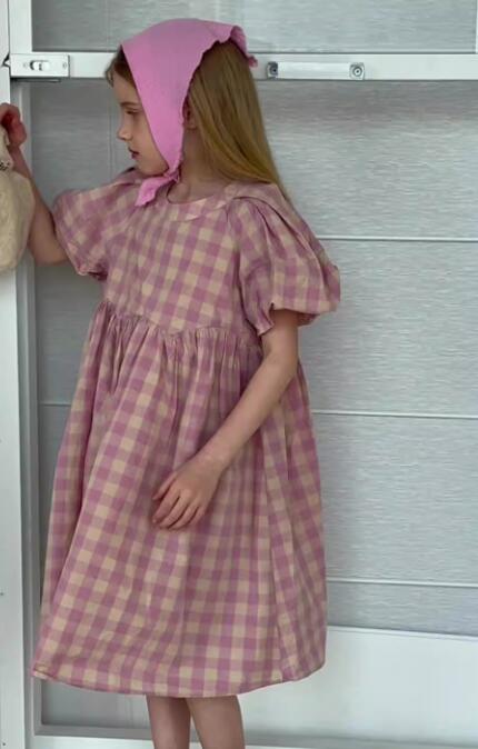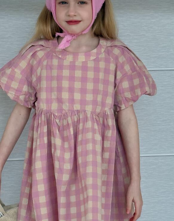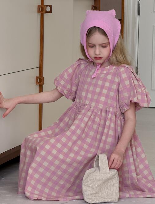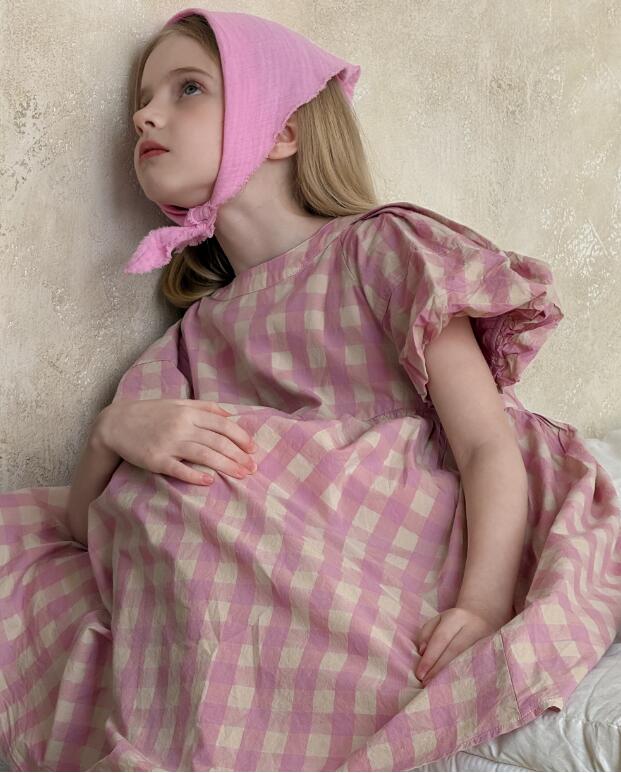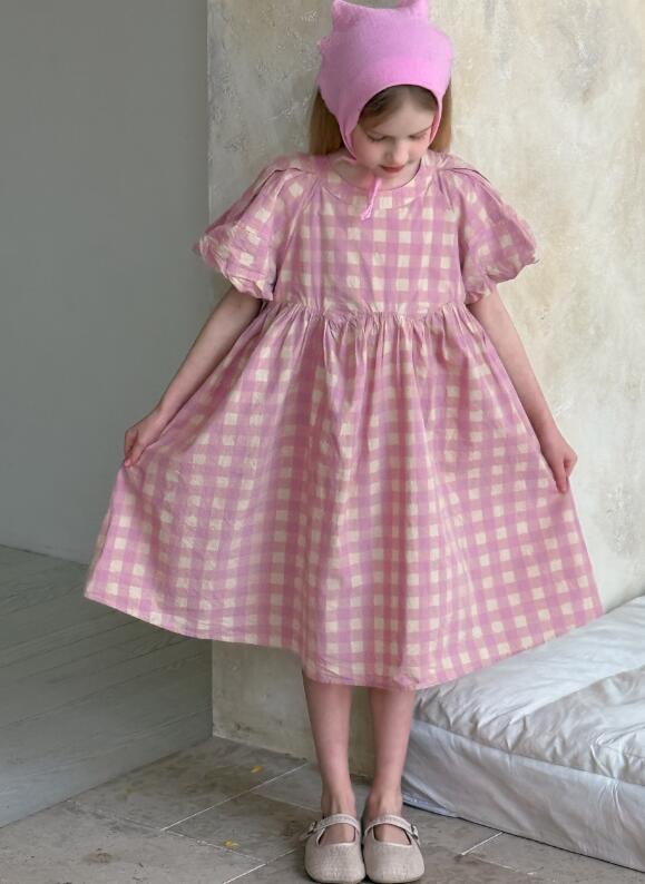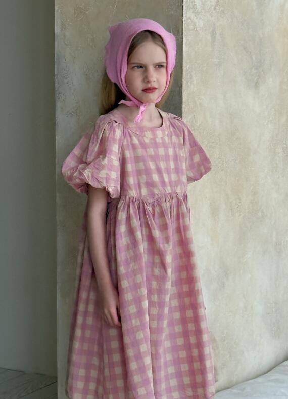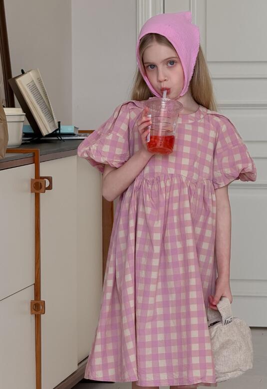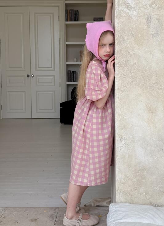 可愛らしいピンクのギンガムチェック柄が特徴的なキッズ用ロングワンピースです。