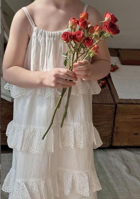 白色の生地に繊細なレース装飾を施した、段ティアードの上品なデザインです。