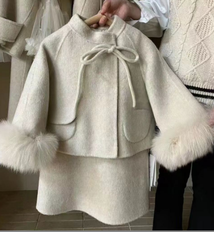 ふわふわファーが付いたケープとロングワンピースの組み合わせで、特別な日のお出かけにぴったり。