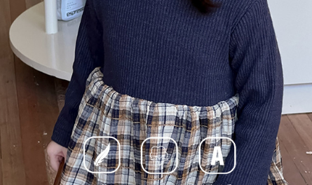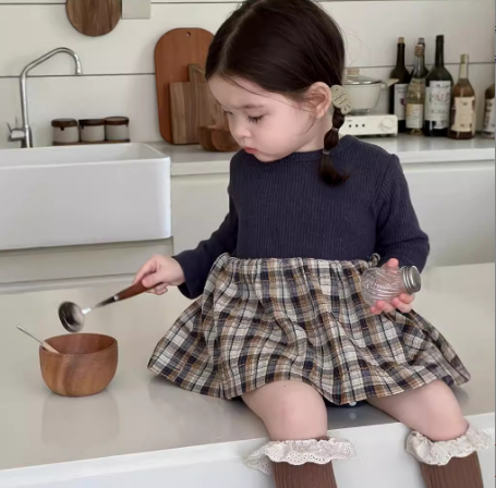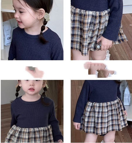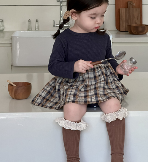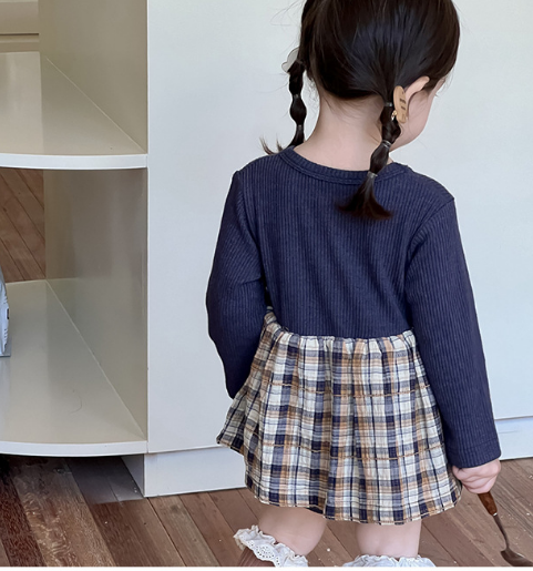 上品な紺色のリブ生地とチェック柄スカートの組み合わせが魅力的。