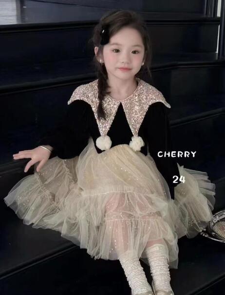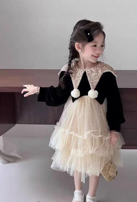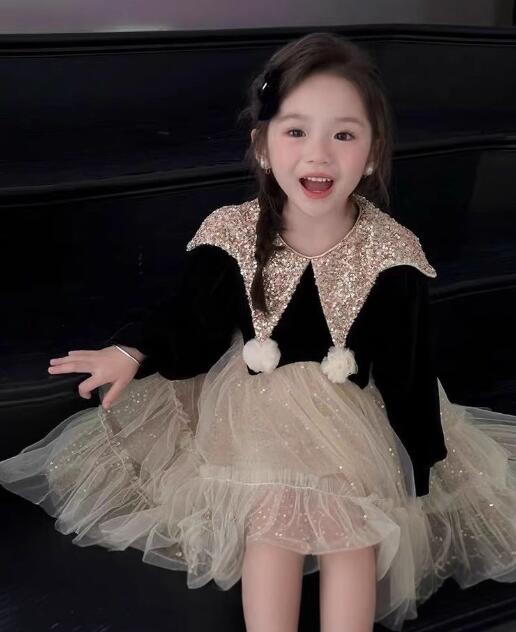 金色のラメ襟と黒いベルベット風長袖が上品な印象を演出します。
