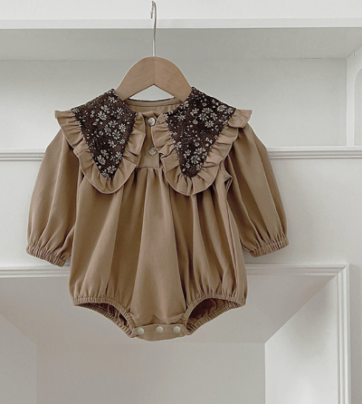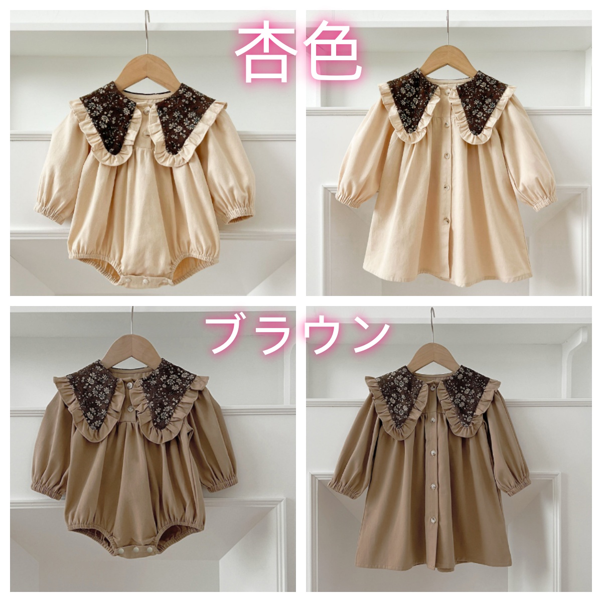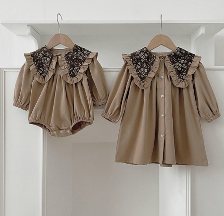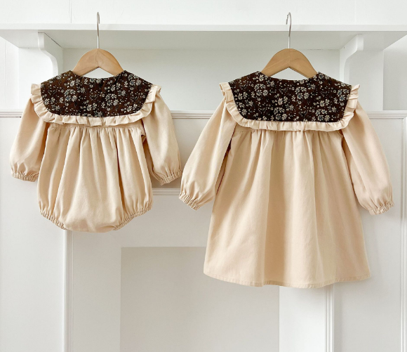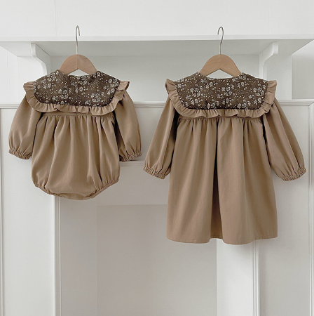ベビー用ロンパースとロングワンピースの2点で、姉妹コーディネートが楽しめます。