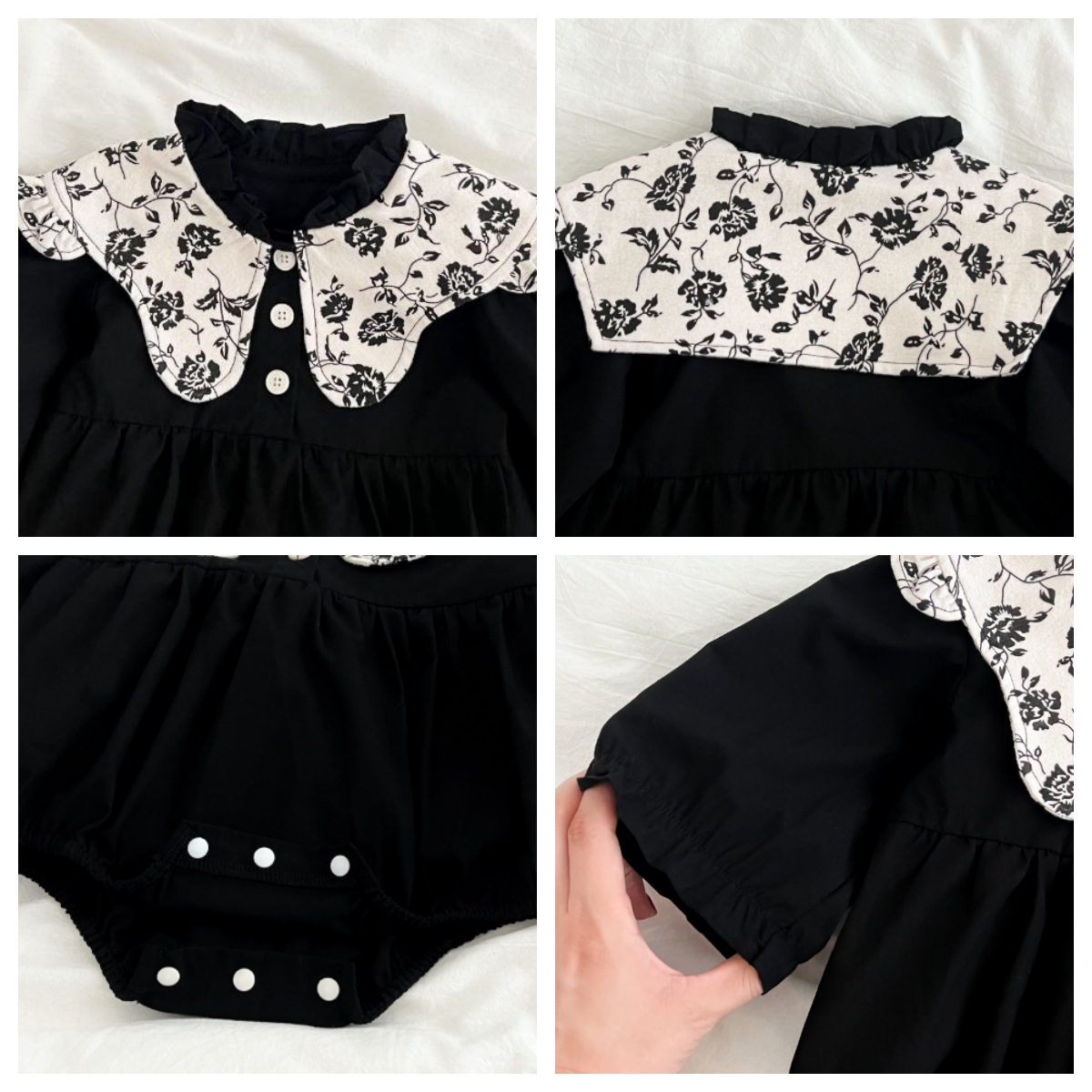 黒ベースに白い花柄襟のデザインで、上品で愛らしい仕上がりになっています。