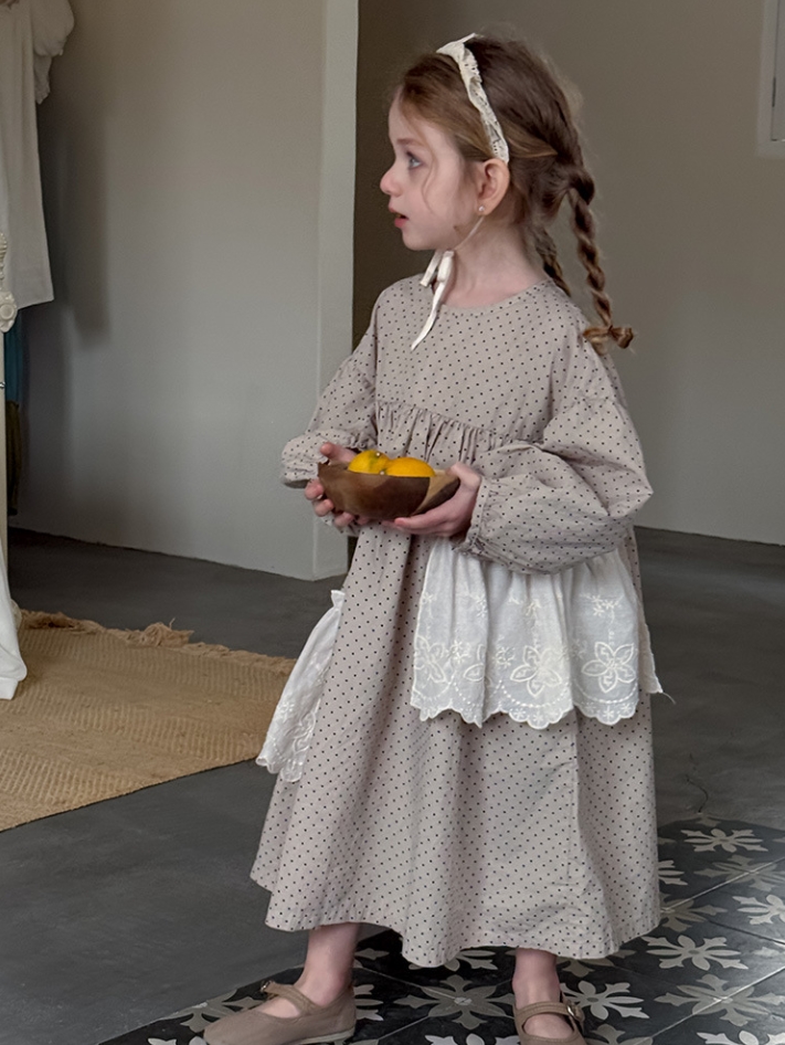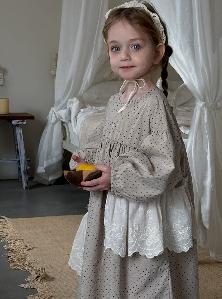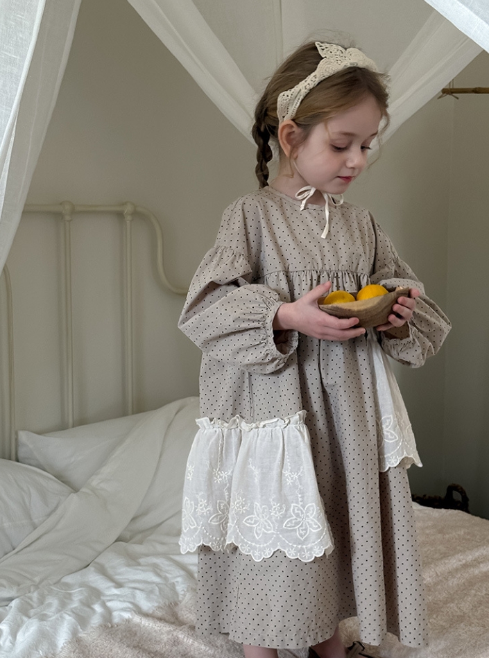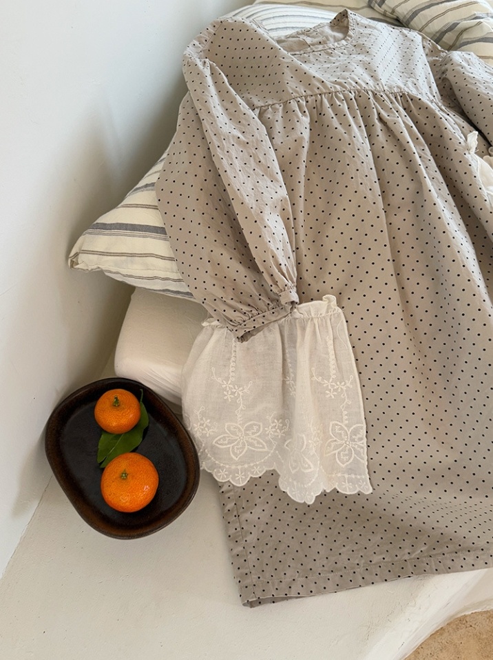 上品な水玉模様とレース装飾が特徴的で、長袖デザインで様々なシーンに活躍します。