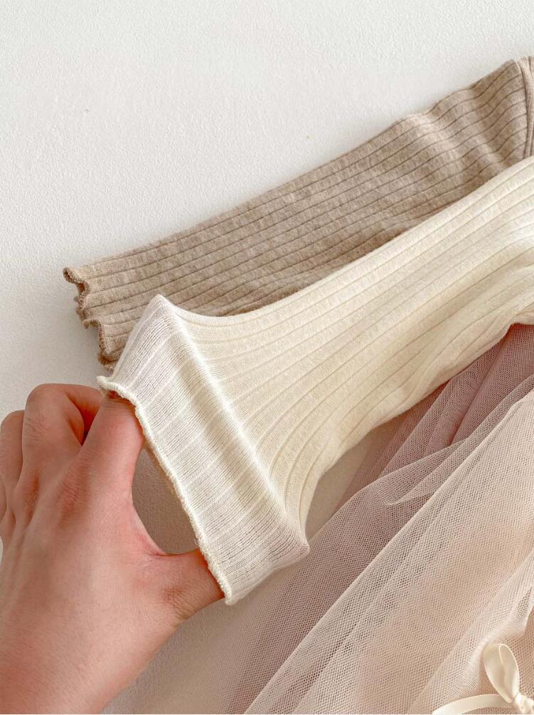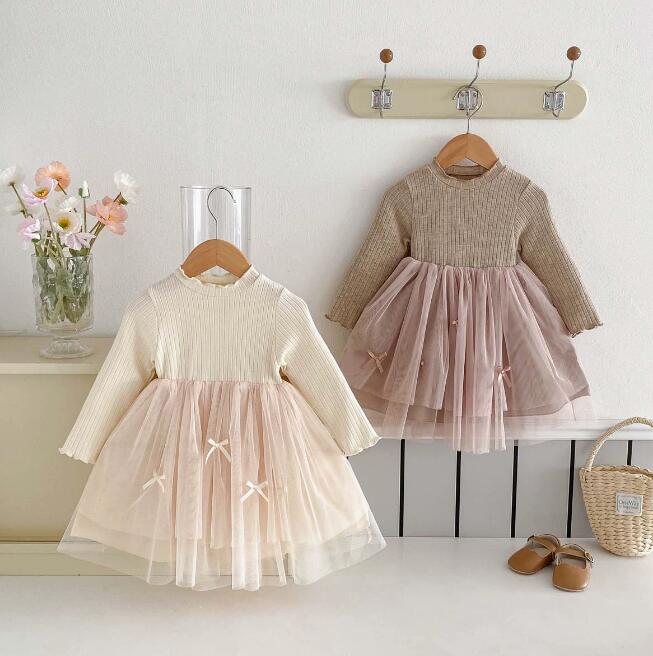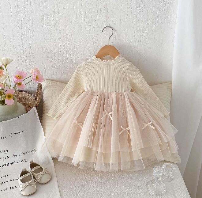 上品なニット素材とふんわりチュールスカートが可愛いキッズ用ロングワンピース。