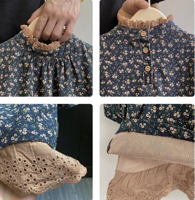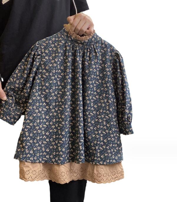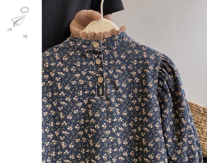 落ち着いたネイビー地に上品な小花模様をあしらい、裾のレース装飾がガーリーな印象を演出します。