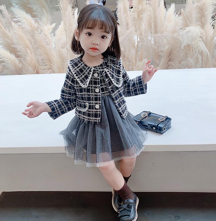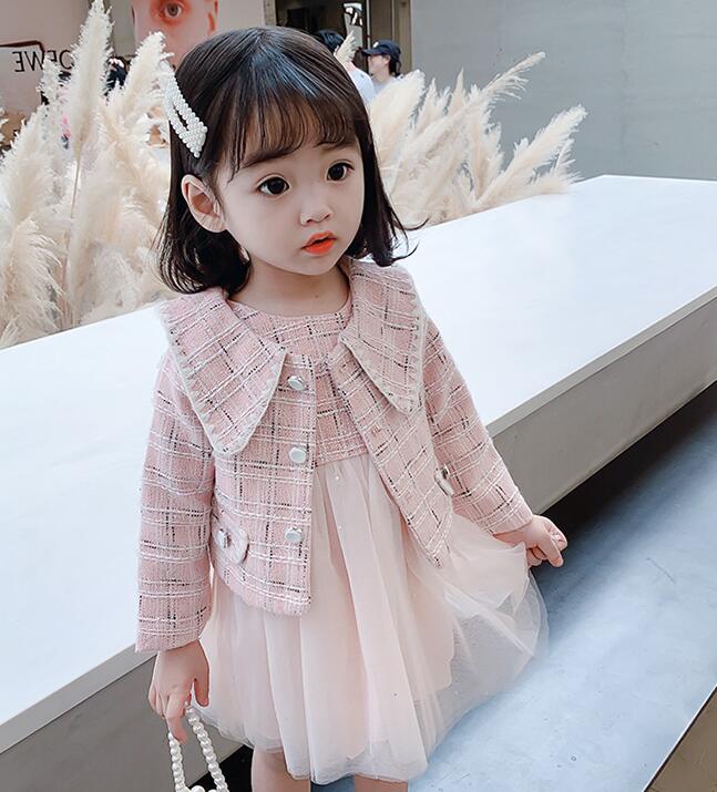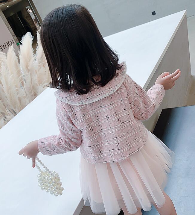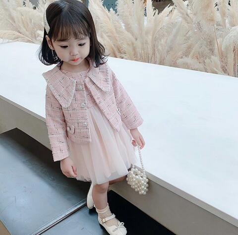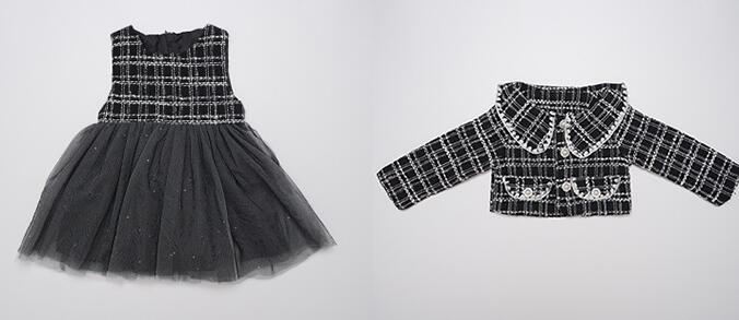 上品なツイード風ジャケットと可愛いロングワンピースのキッズ向け二点組です。
