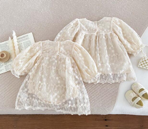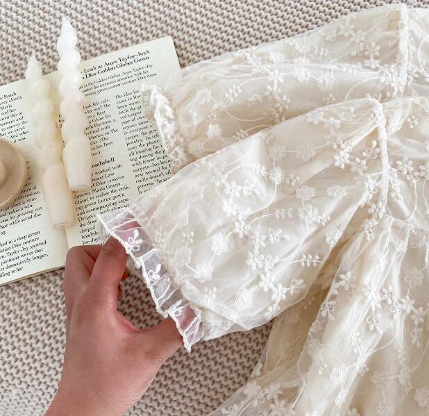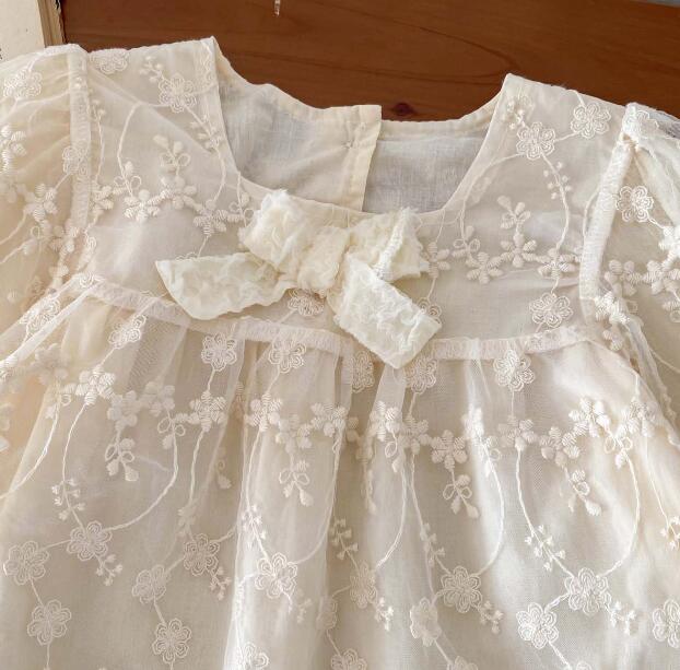 柔らかな白色の生地に繊細な刺繍を施し、襟元のリボンがアクセントになっています。
