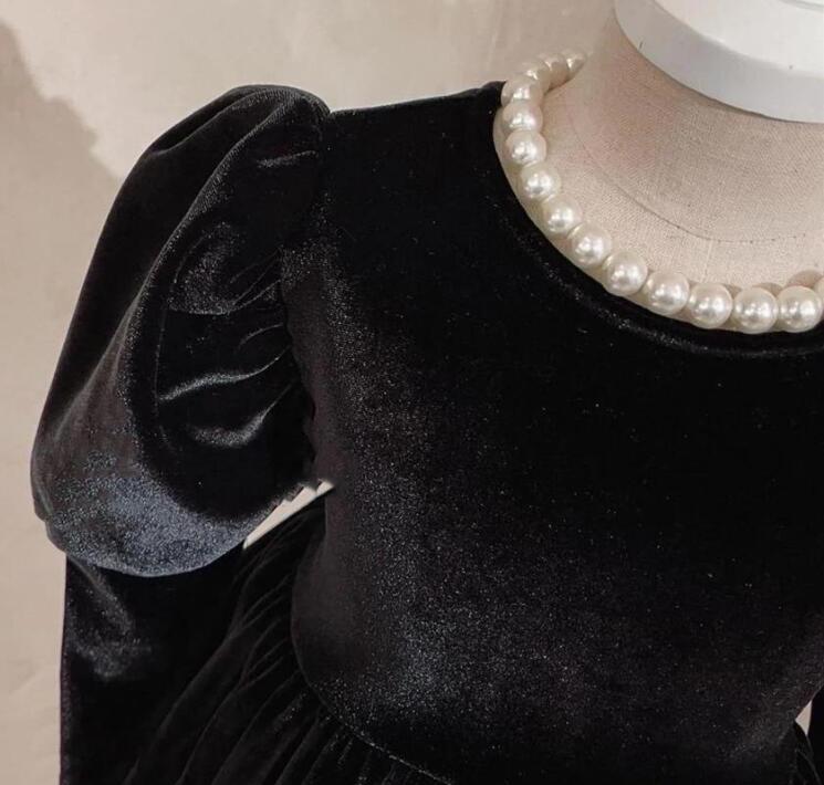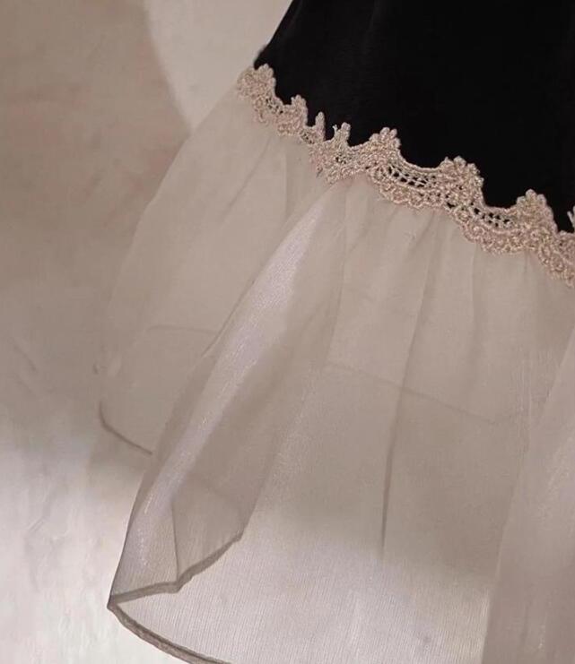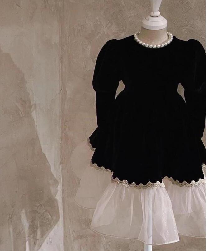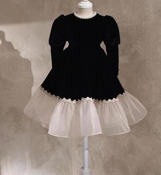 上品な黒のベロア素材と白のチュールスカートが美しいキッズ用ロングワンピース。