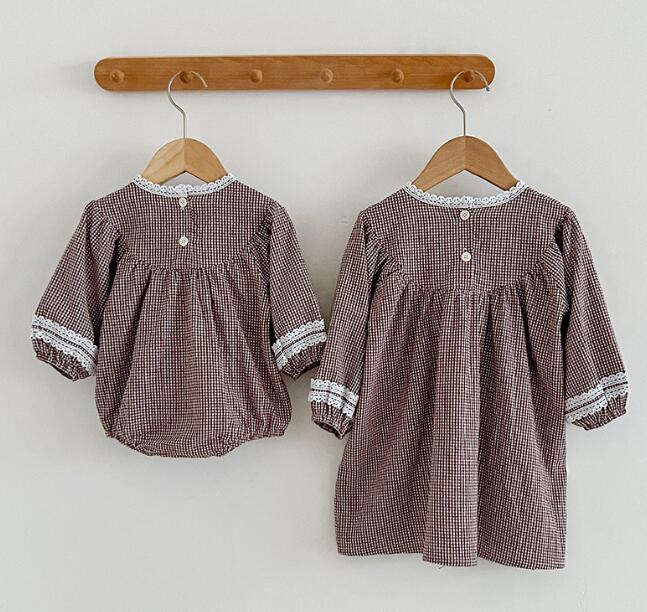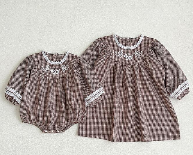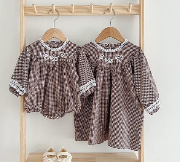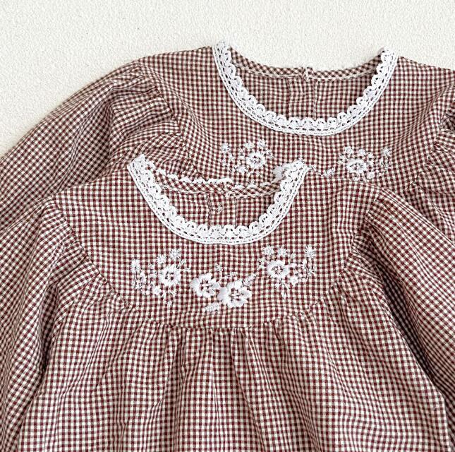可愛い花刺繍とギンガムチェック柄が魅力的なキッズ用ロンパースとロングワンピースのセット商品です。