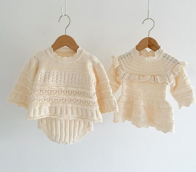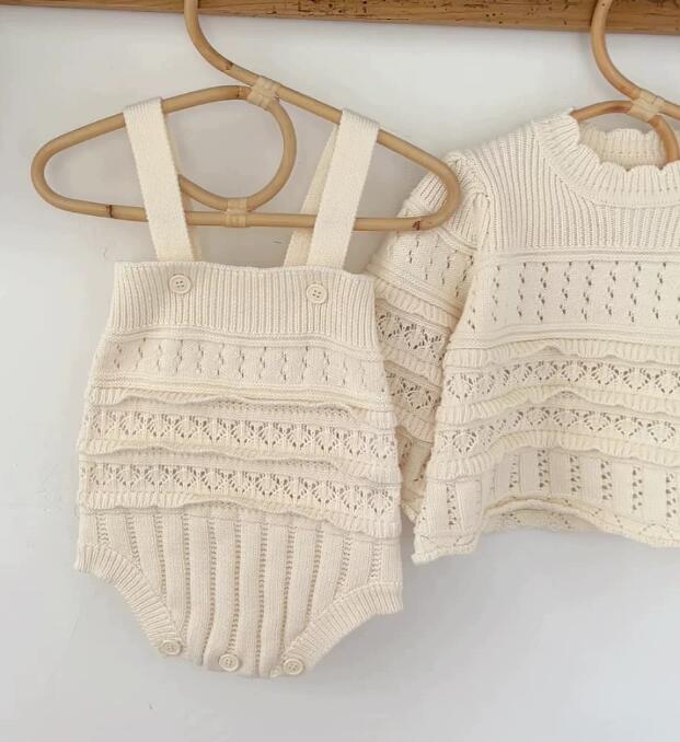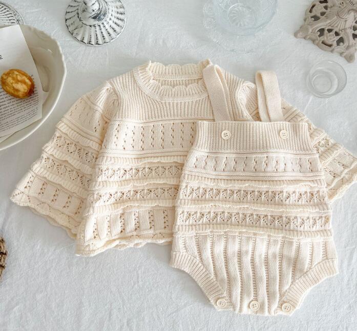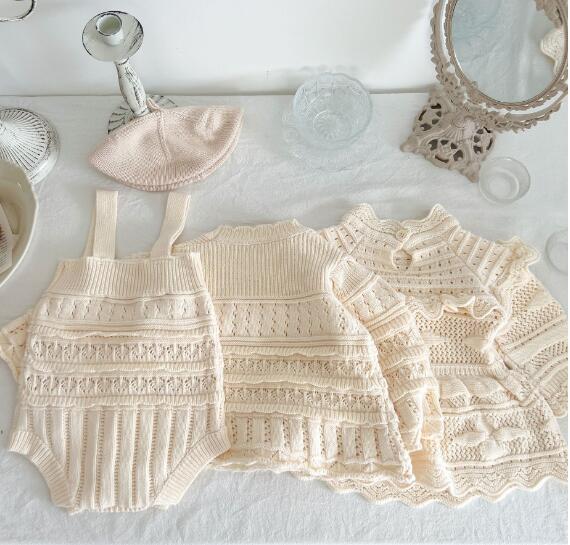 上品なベージュカラーの編み込みニットが美しいキッズ用三点セットです。
